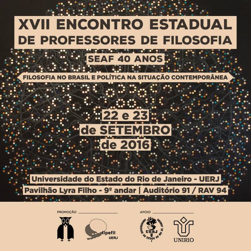 Olá amigos, neste dia 23 de Setembro a partir das 14h estarei participando do "XVII Encontro Estadual de Professores de Filosofia: Filosofia no Brasil e Política na Situação Contemporânea". Na oportunidade estarei na mesa que discutirá Filosofia e Mídia. Todos que puderem aparecer serão bem vindos, a inscrição é gratuita e pode ser realizada durante o evento. Uma iniciativa muito importante da SEAF e do LLPEFIL neste cenário conjuntural tão difícil ao qual estamos inseridos.